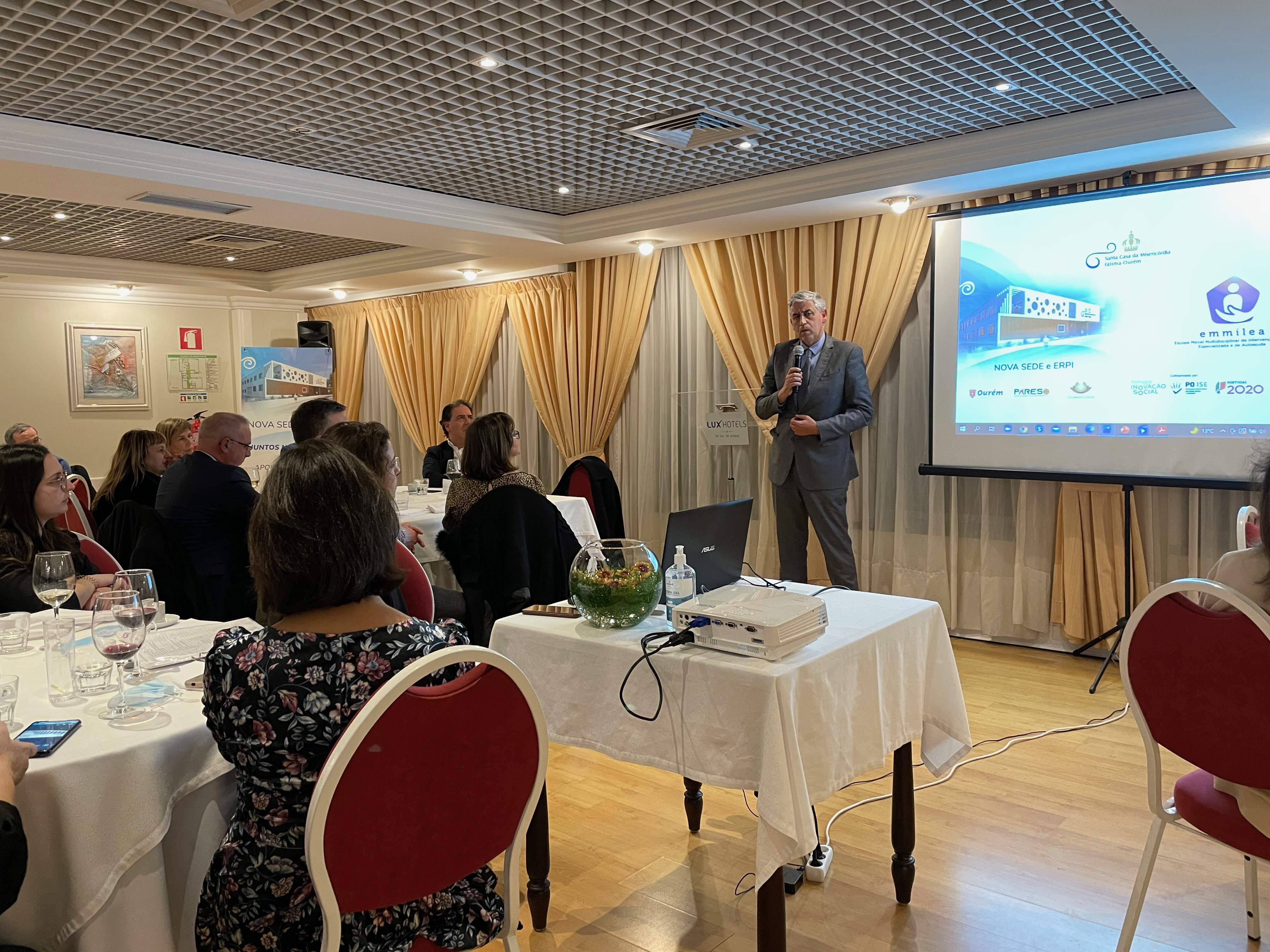 A EMMILEA (Equipa Móvel Multidisciplinar de Intervenção Local Especializada e Autoajuda) é o mais recente projeto de intervenção comunitária da Santa Casa que teve o seu início a 01-02-2022. Fruto da aprovação de candidatura ao Portugal Inovação Social conta também com o apoio de diversos investidores sociais, públicos e privados. No jantar de apresentação realizado no Hotel Lux Mundi em 18 de março de 2022, contámos com as honrosas presenças da Sra. Representante Regional do Centro da Iniciativa Pública Portugal Inovação Social, Alexandra Neves, do Sr. Presidente da Câmara Municipal de Ourém, Luís Albuquerque, do Sr. Diretor do Centro Distrital de Santarém da Segurança Social, Renato Possante Bento, de vários dos investidores sociais privados e de amigos que acompanham a vida desta Santa Casa.